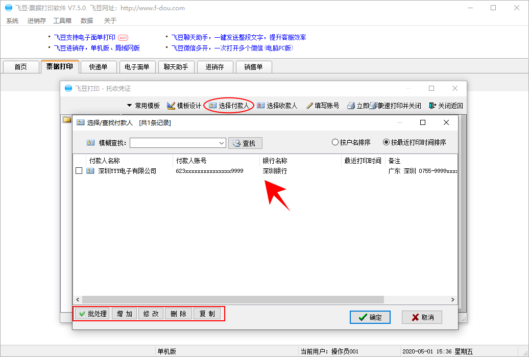 3、点击【选择付款人】,可以在这里选择已有付款人,也可以增加修改删除付款人信息: