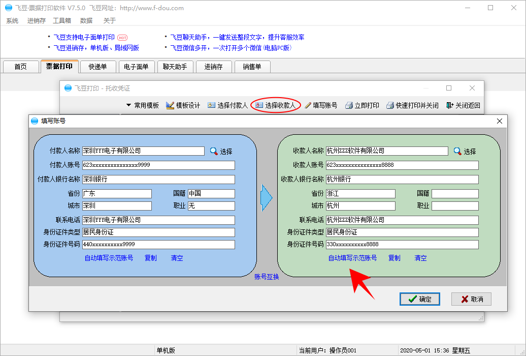 6、在银行托收凭证模版上,录上金额(飞豆软件自动转换金额大小写),票据种类,票据张数,票据号码等相关信息