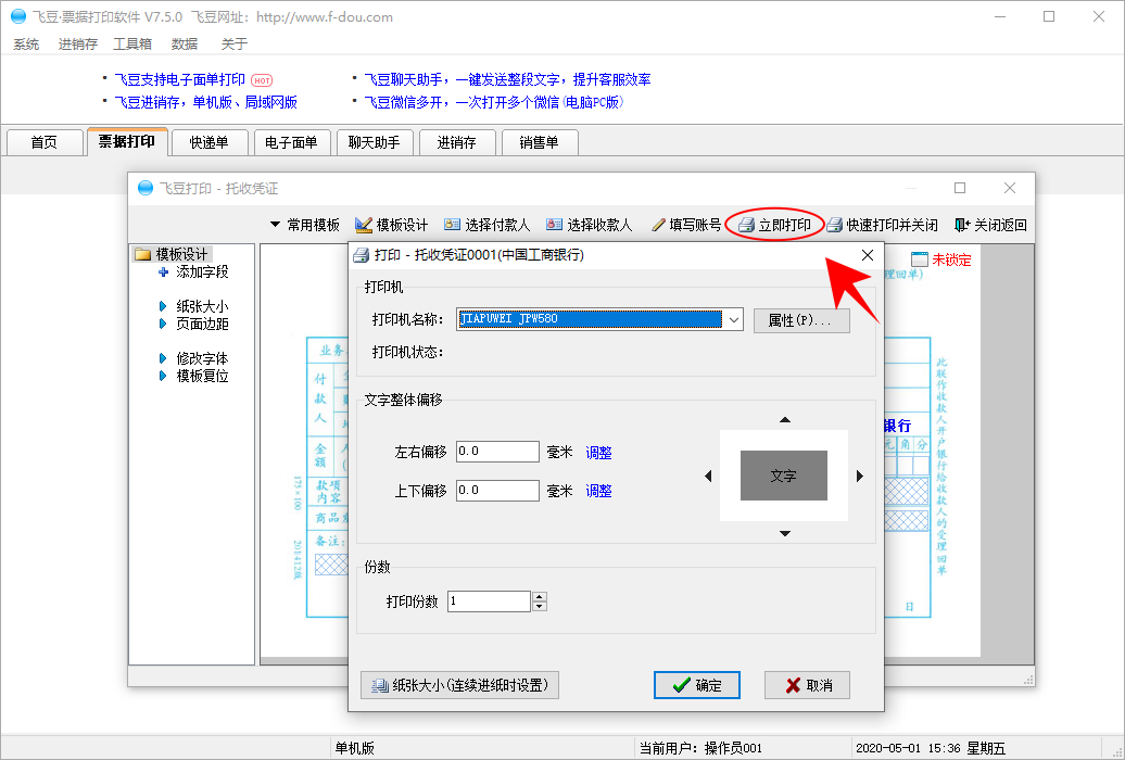 飞豆票据打印软件是一款所见即所得,操作简单,免费专业的票据打印软件,它支持多种多种托收凭证打印,用户可以自由随意调整托收凭证内容位置,锁定托收凭证模板,轻松快速高效的打印出规范、专业的银行托收凭证。