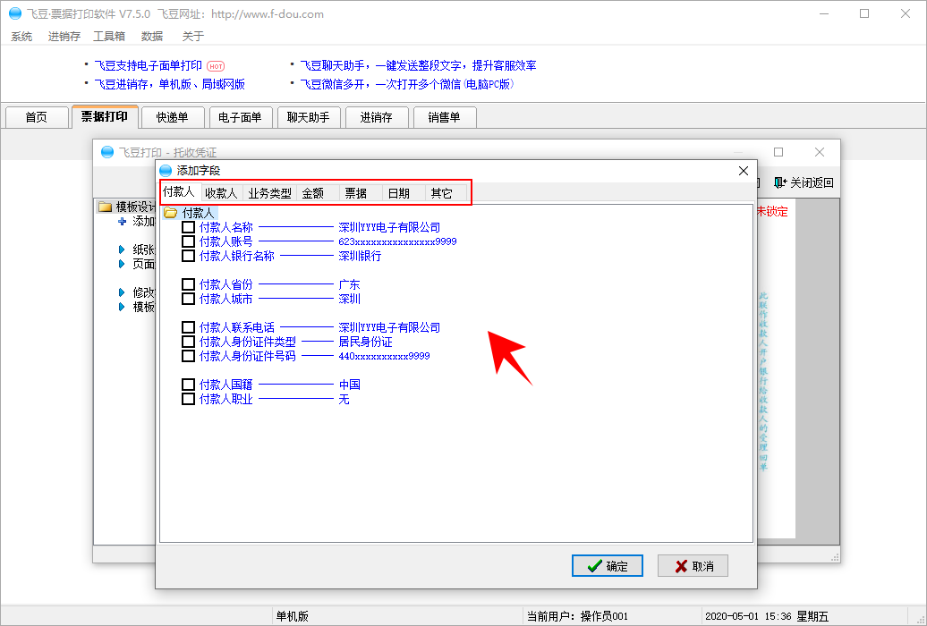 1、点击【添加字段】:可以在付款人、收款人、业务类型、金额、票据、日期等选项里,勾选相应字段进行添加:
