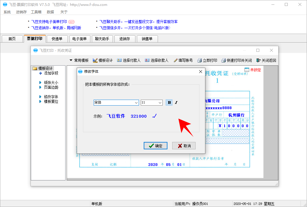 5、点击【批量修改字体】:可以将托收凭证模板所有字体进行修改:
