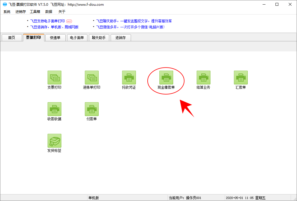 1、进入飞豆票据打印软件,点击【现金缴款单】