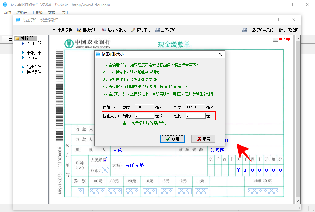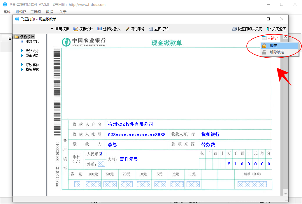 飞豆票据打印软件是一款所见即所得,操作简单,免费专业的票据打印软件,它支持多种多种现金缴款单打印,用户可以自由随意调整现金缴款单内容位置,锁定现金缴款单模板,轻松快速高效的打印出规范、专业的现金缴款单。