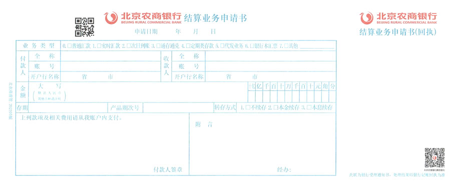 模板名称:结算业务0090(北京农商银行结算业务申请书)