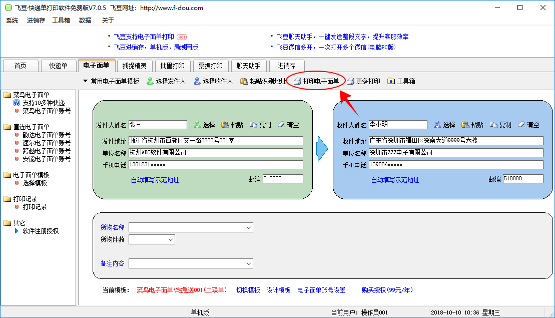 3、注册好菜鸟并关联飞豆软件后, 打开电子面单打印模块,点击【常用电子面单模板】: