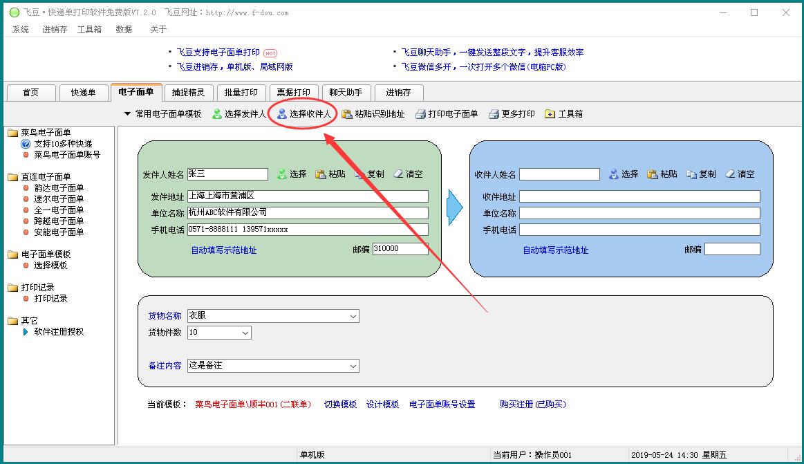 飞豆快递单打印软件V7.20新增了导入收件人资料功能,可以从Excel导入收件人资料,导入之后,会存储在飞豆软件中,以后使用时,选择一下即可。