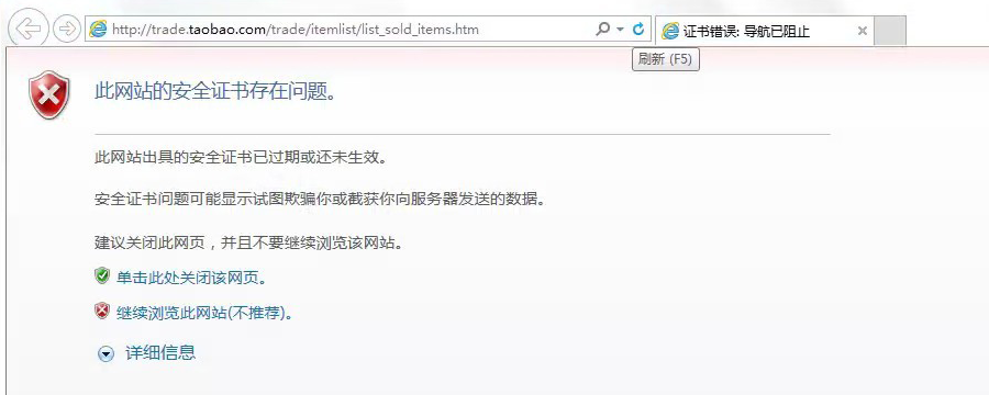 登录淘宝时出现“此网站的安全证书不存在”(如下图所示)如何处理?