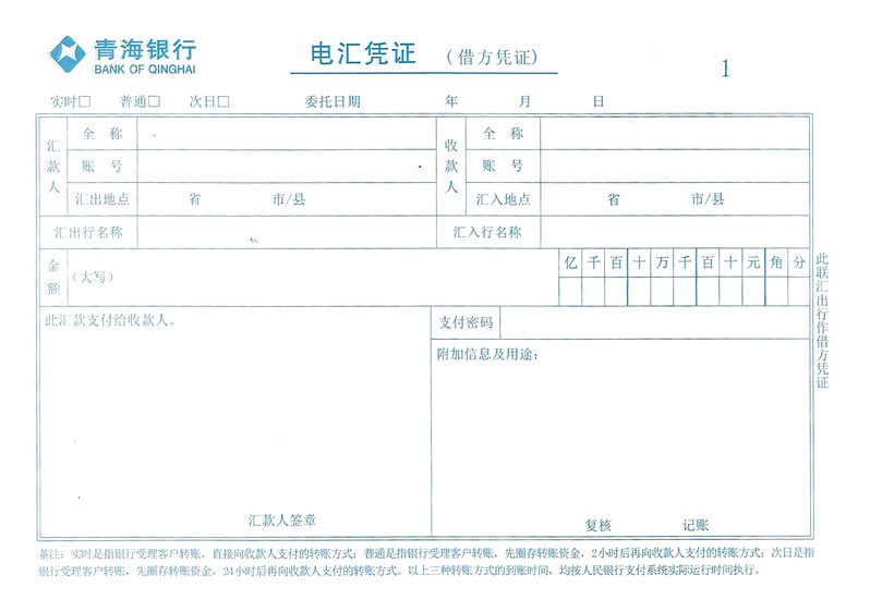 模板名称:汇款单0045(青海银行,电汇凭证)