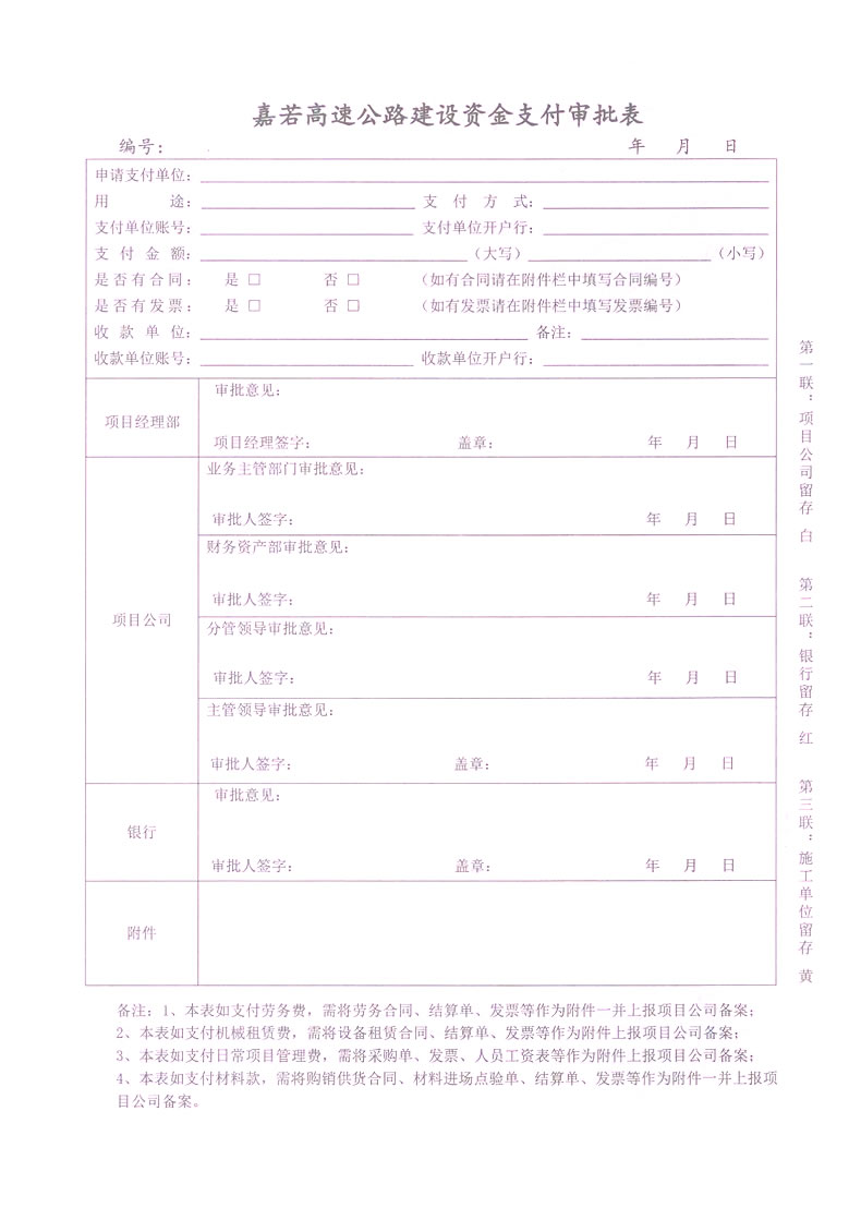 模板名称:付款单0020(嘉若高速公路建设资金支付审批表)