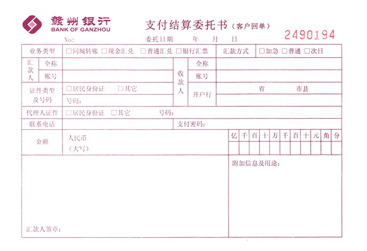 模板名称:结算业务0088(赣州银行,支付结算委托书)
